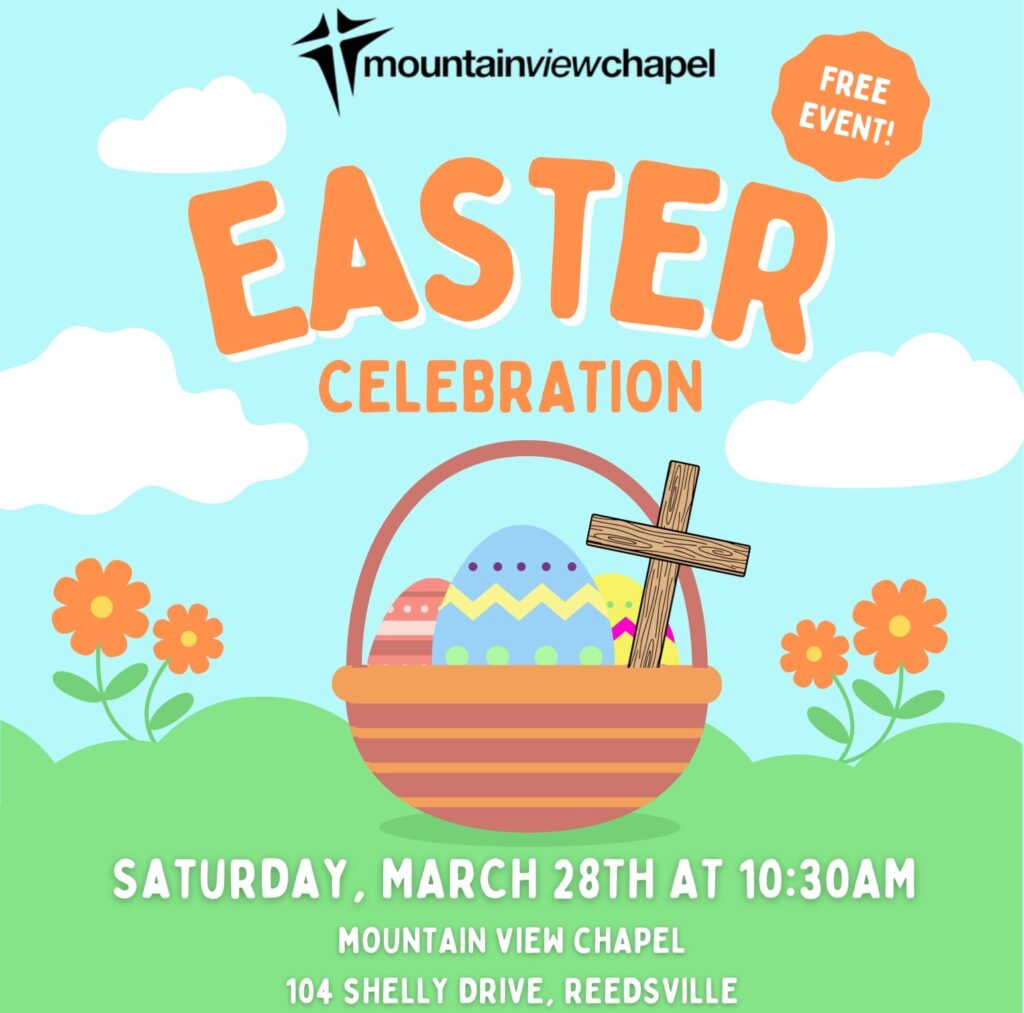 Mountain View Chapel in Reedsville will be having an Easter Celebration on Saturday, March 28th Registration starts at 10:20am and the event starts at 10:30. There will be a kids Easter story, kids egg hunt for kids 12 and under, light lunch for the community, crafts, face painting, snow cones, cotton candy, and popcorn.