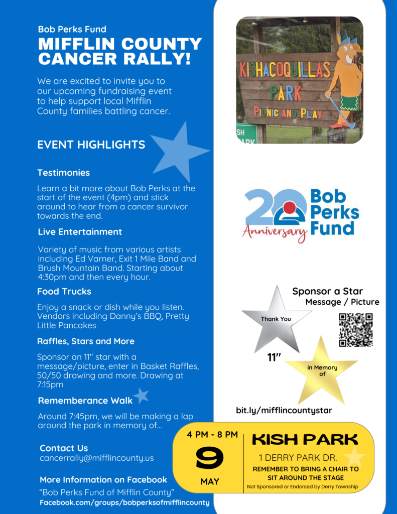Join the Mifflin County Cancer Rally on Saturday, May 9th from 4 to 8 PM at Kish Park in Lewistown, benefiting the Bob Perks Fund and helping local Mifflin County families battling cancer. The evening kicks off at 4 PM with opening testimonies, followed by live entertainment. Enjoy food trucks, basket raffles, 50/50 drawings, games, and more throughout the evening. You can also sponsor an 11-inch star with a special message or memory.